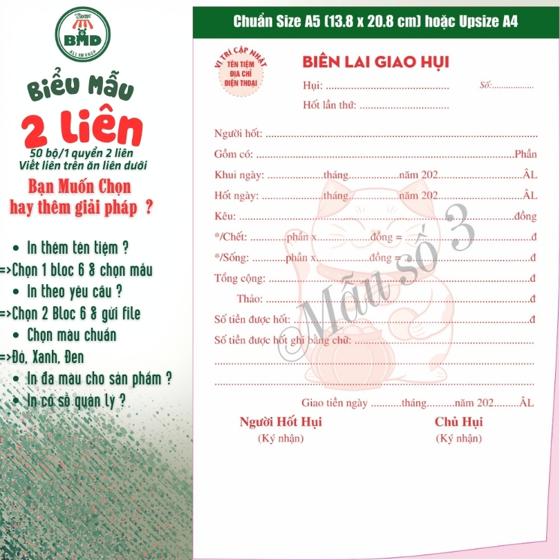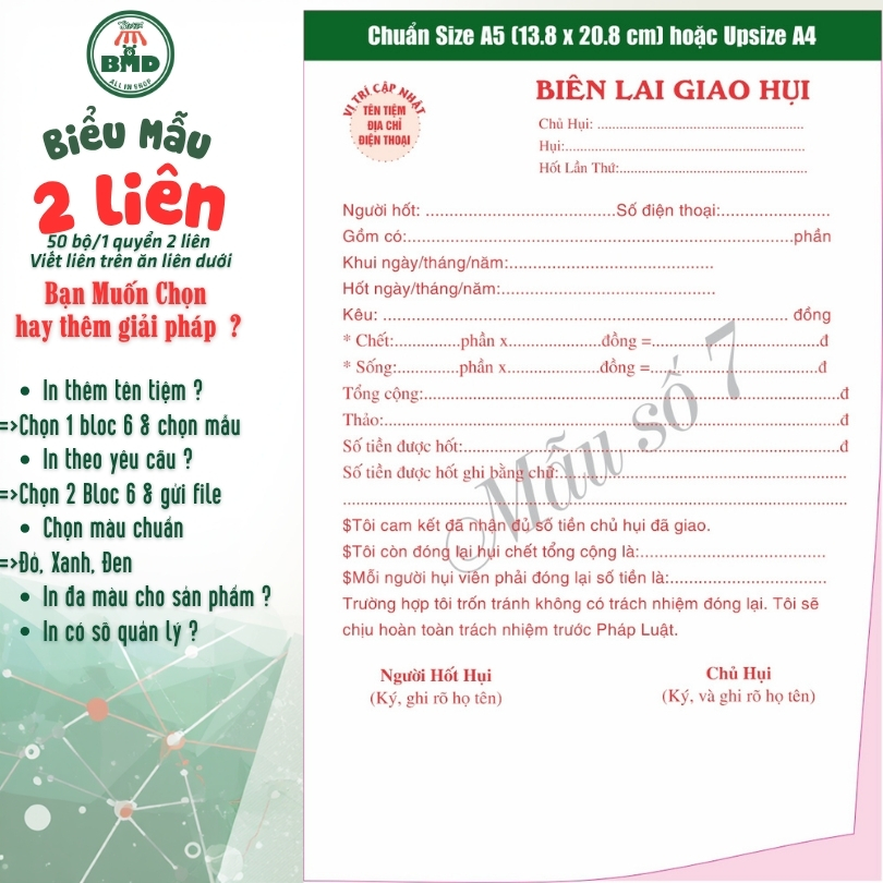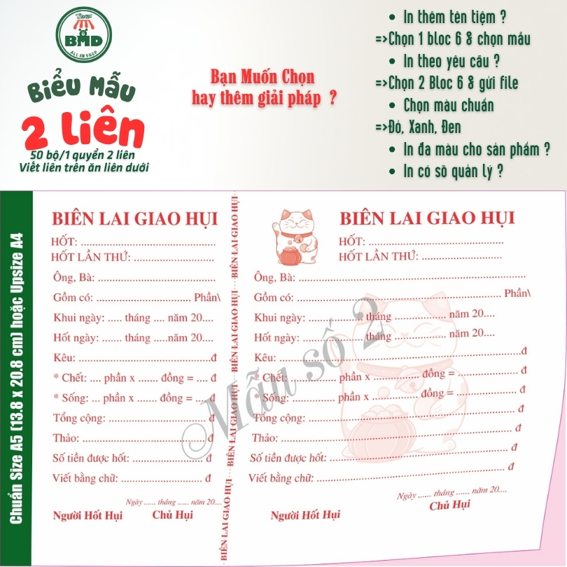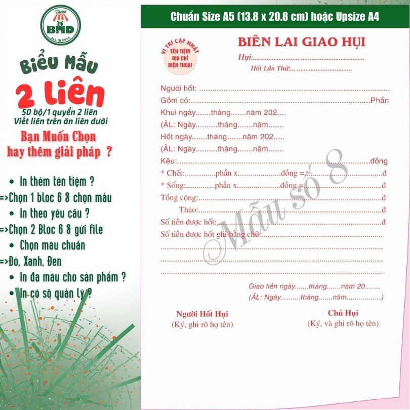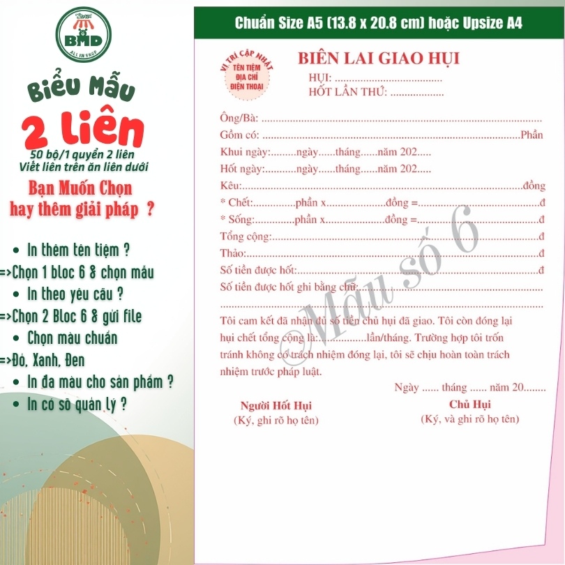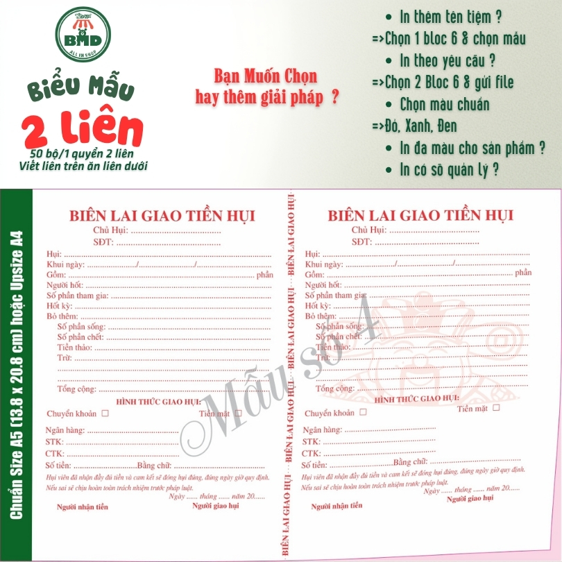 Biên lai giao hụi 2 liên-Bloc 2 (in sẵn) & Bloc 6 (chọn mẫu in tên) hoặc theo thiết kế