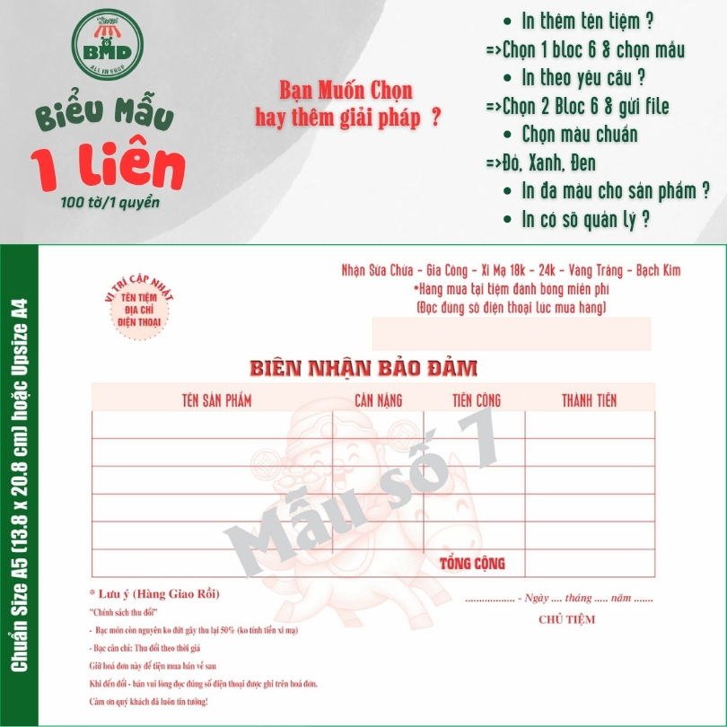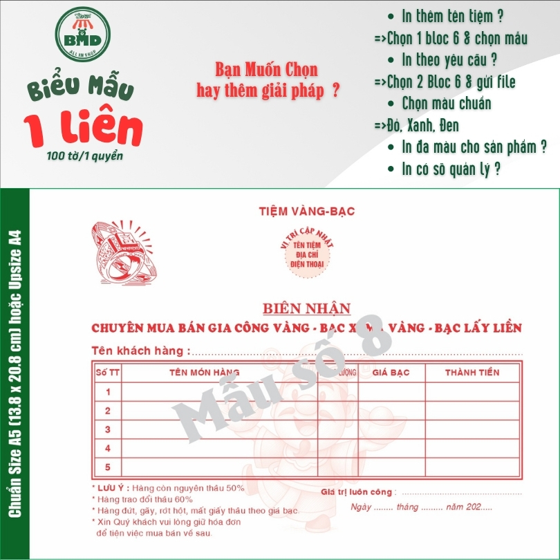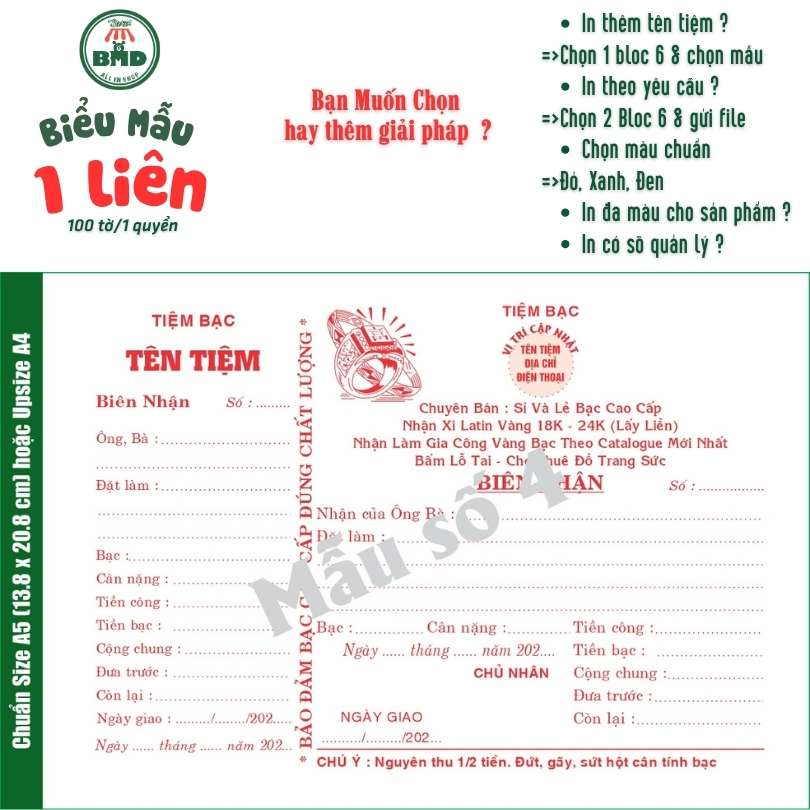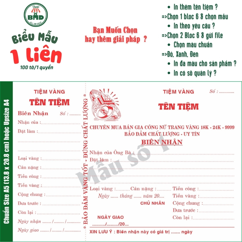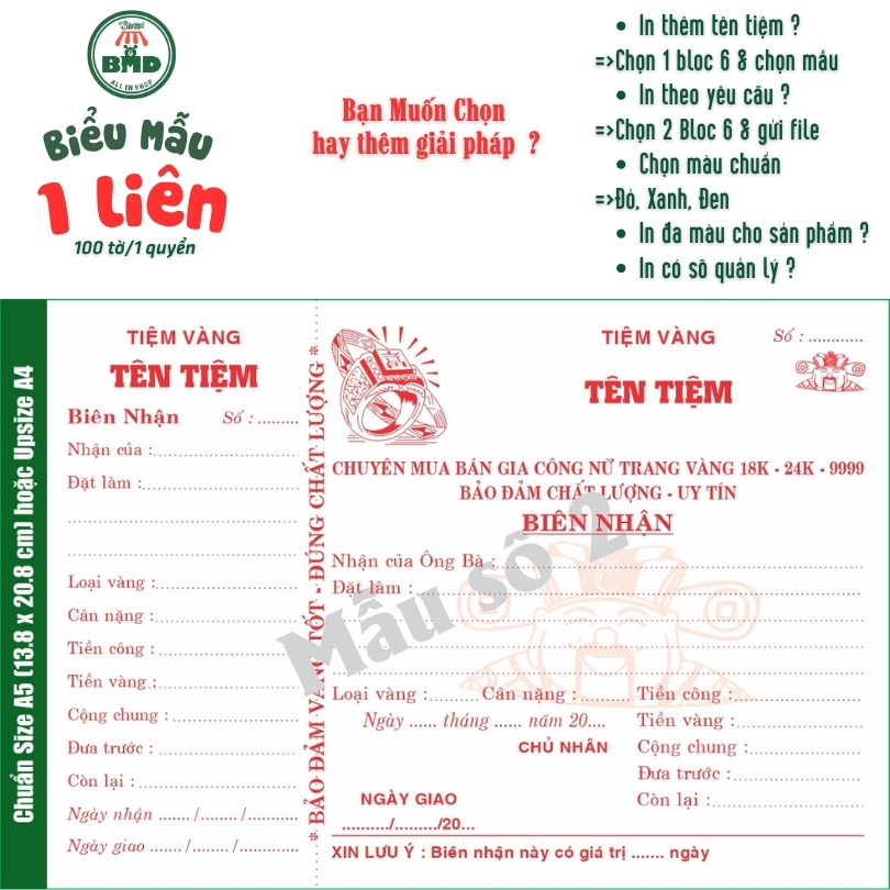 Biên Nhận tiệm vàng 1 liên-Bloc 2 (in sẵn) & Bloc 6 (chọn mẫu in tên) hoặc theo thiết kế