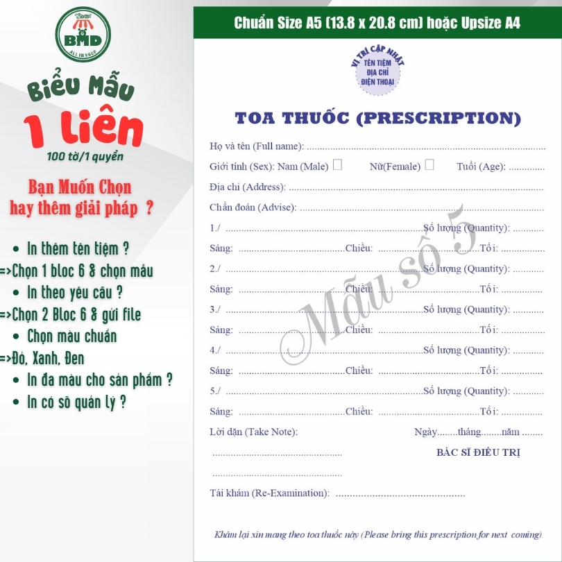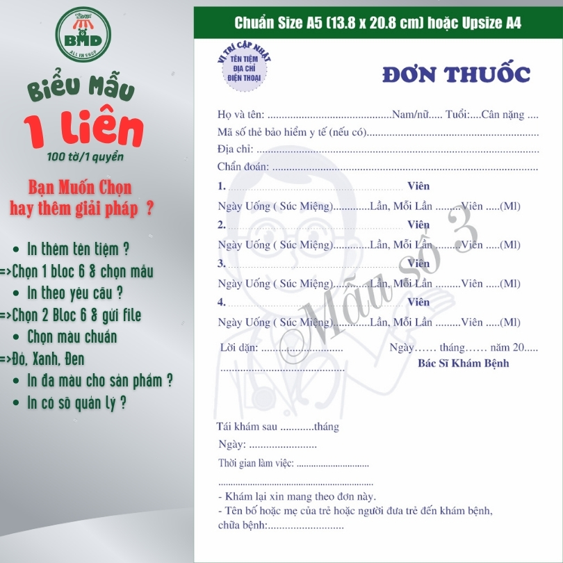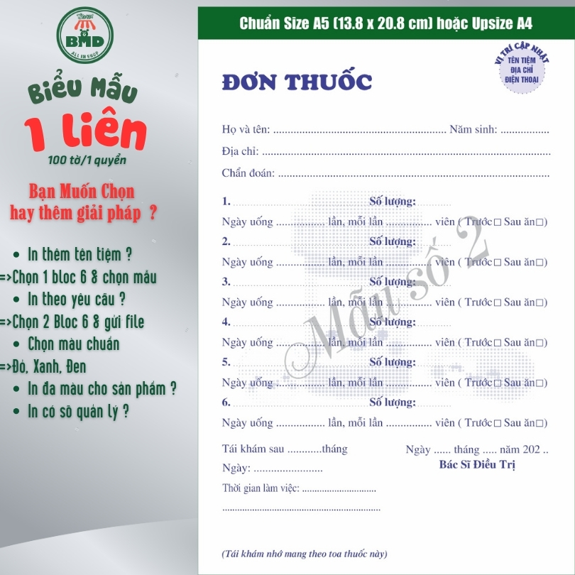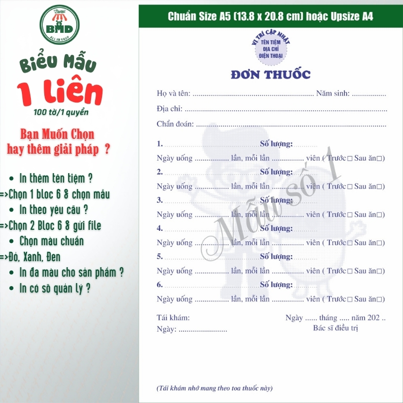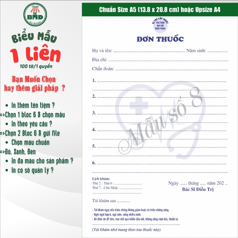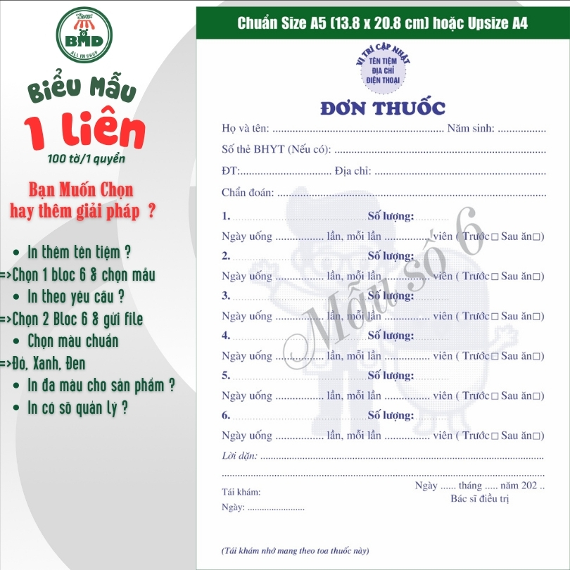 Đơn thuốc 1 liên-Bloc 2 (in sẵn) & Bloc 6 (chọn mẫu in tên) hoặc theo thiết kế