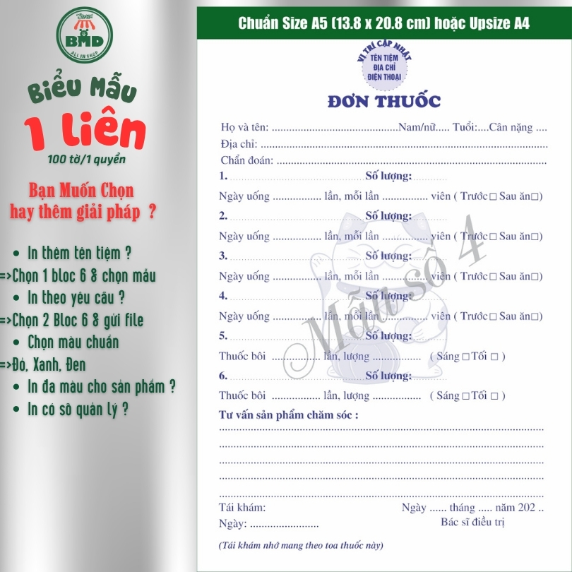 📝 ĐƠN THUỐC 1 LIÊN – BLOC 2 & BLOC 6 (In theo mẫu có sẵn hoặc thiết kế theo yêu cầu) 📦 SẢN PHẨM DẠNG BLOC 🔹 BLOC 2 QUYỂN (IN SẴN) Chọn mẫu có sẵn Phù hợp cần in nhanh – tiết kiệm chi...