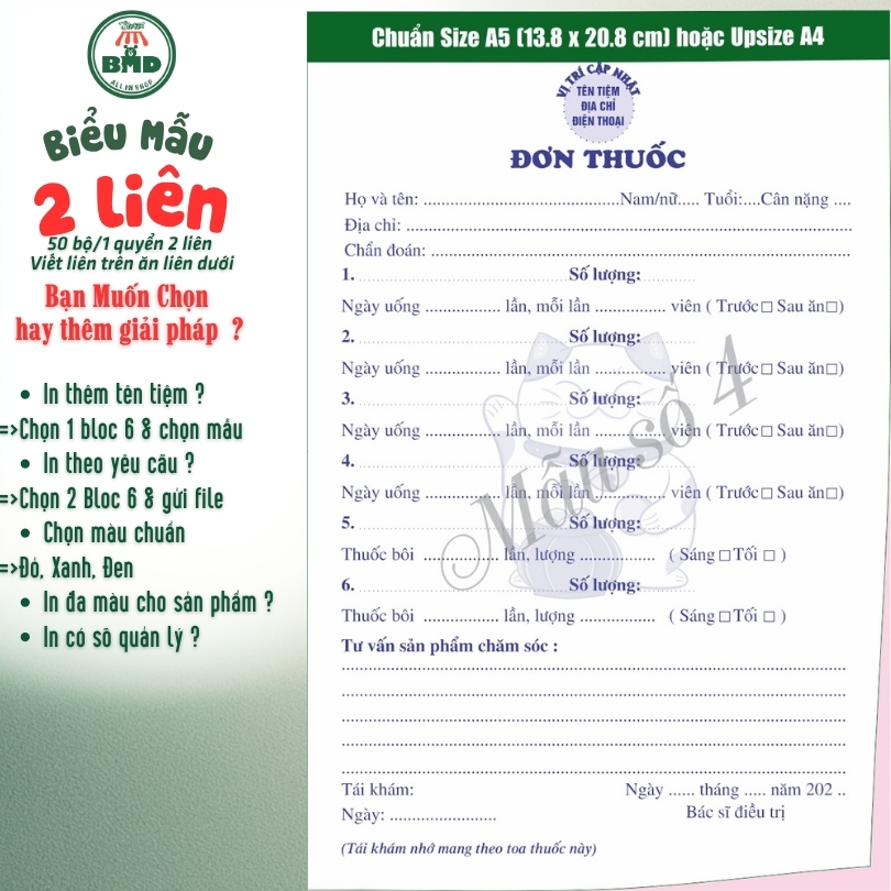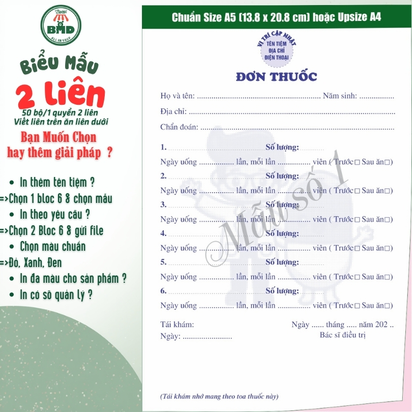 📝 ĐƠN THUỐC 2 LIÊN – BLOC 2 & BLOC 6 (In theo mẫu có sẵn hoặc thiết kế theo yêu cầu) 📦 SẢN PHẨM DẠNG BLOC 🔹 BLOC 2 QUYỂN (IN SẴN) Chọn mẫu có sẵn Phù hợp cần in nhanh – tiết kiệm chi...
