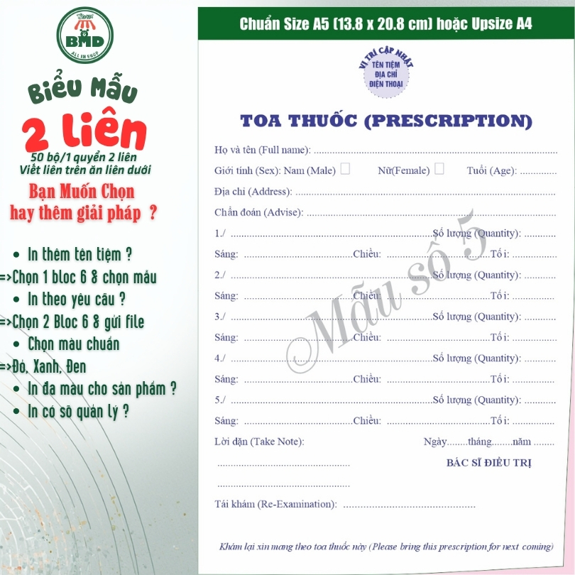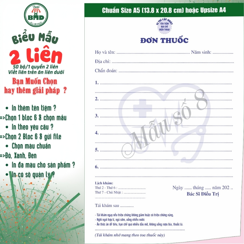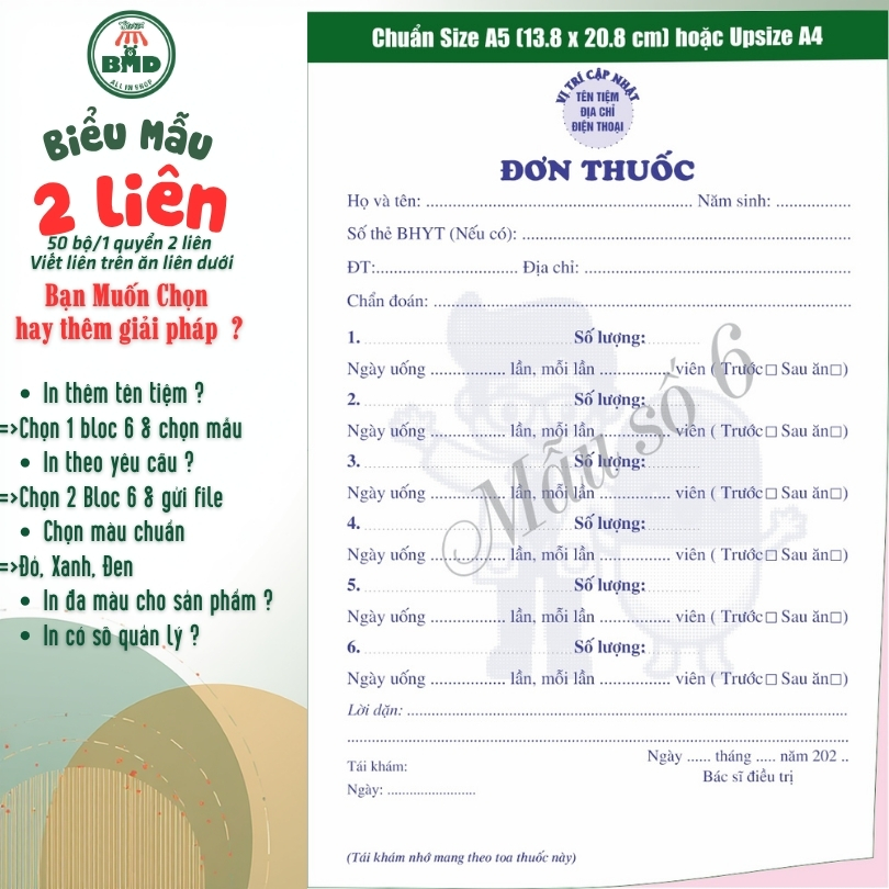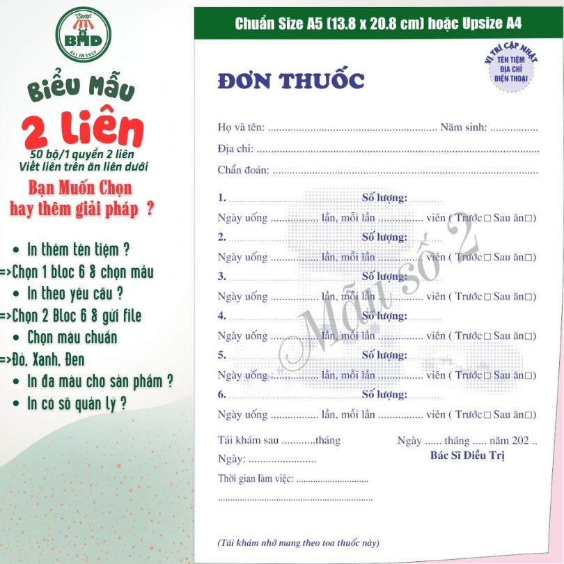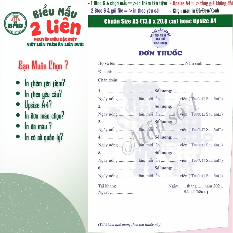 Đơn thuốc 2 liên-Bloc 2 (in sẵn) & Bloc 6 (chọn mẫu in tên) hoặc theo thiết kế