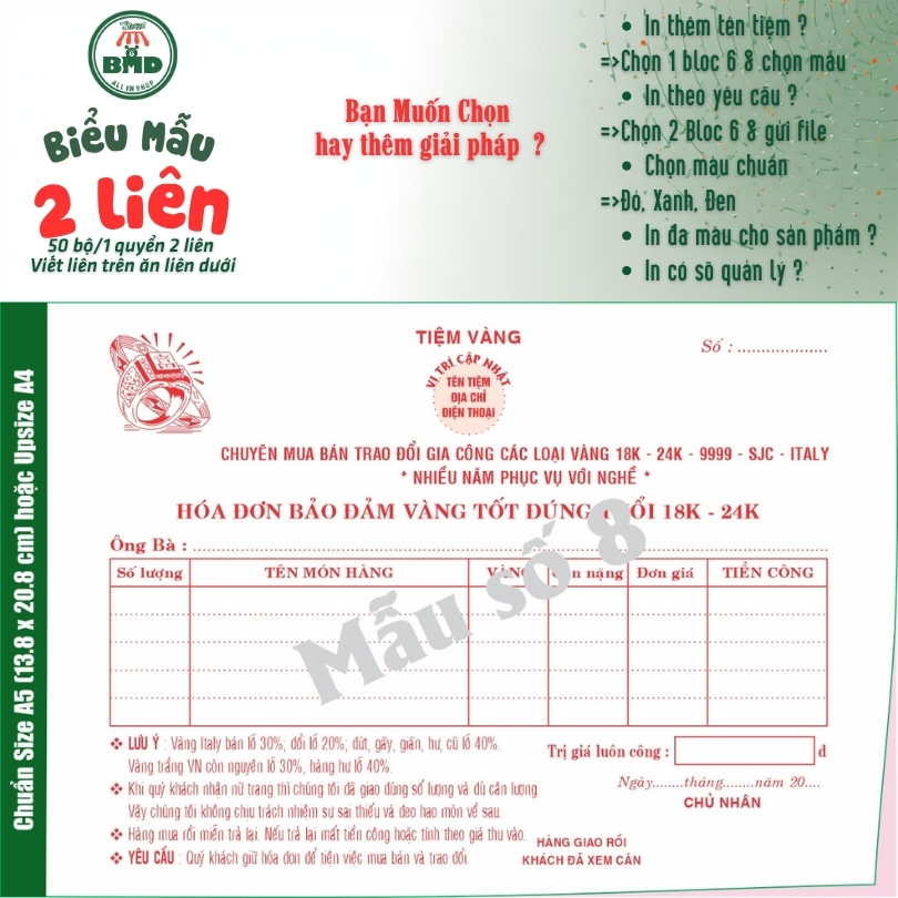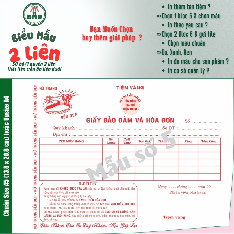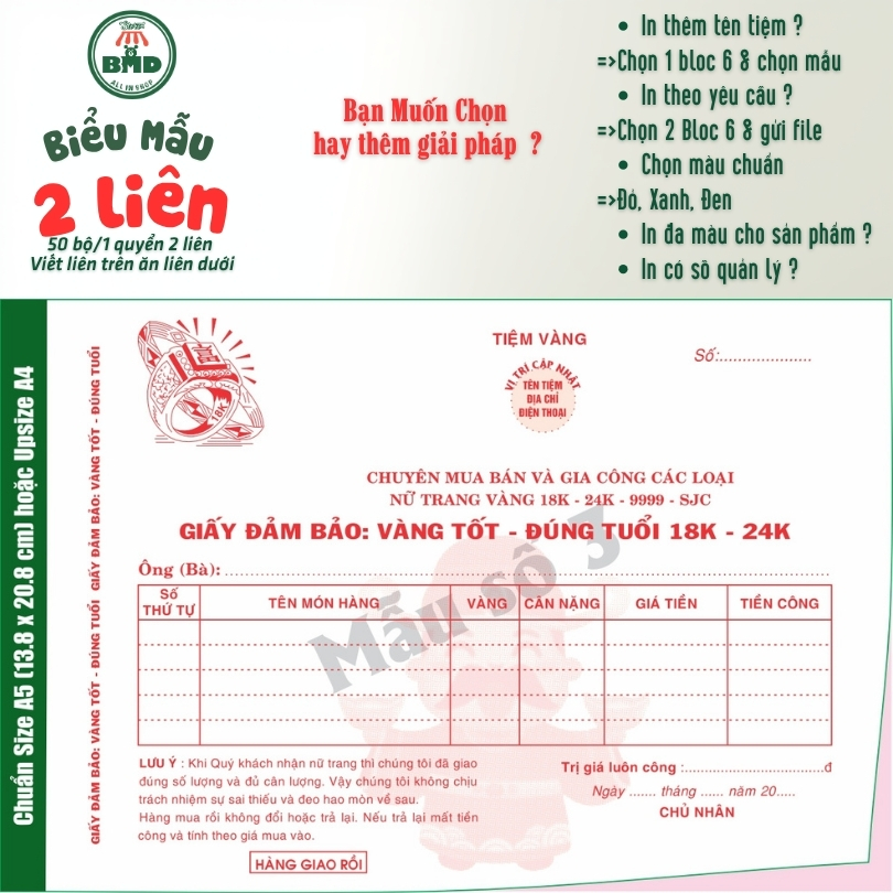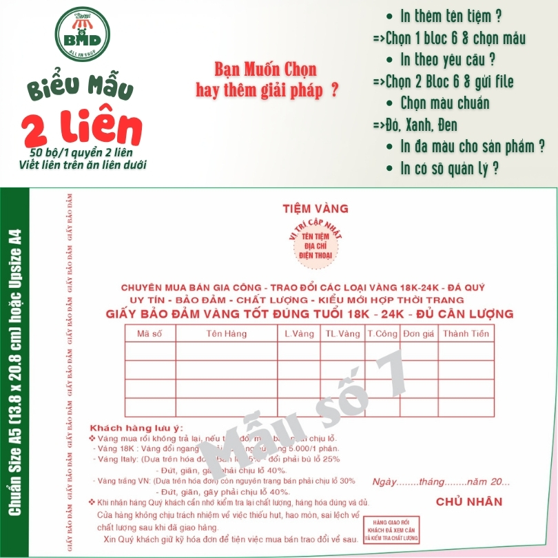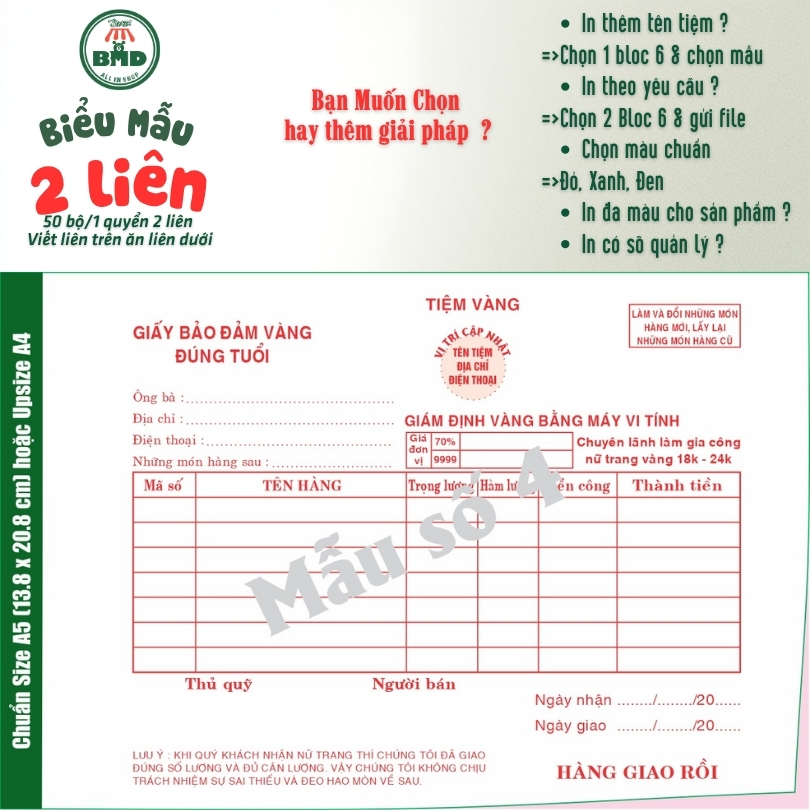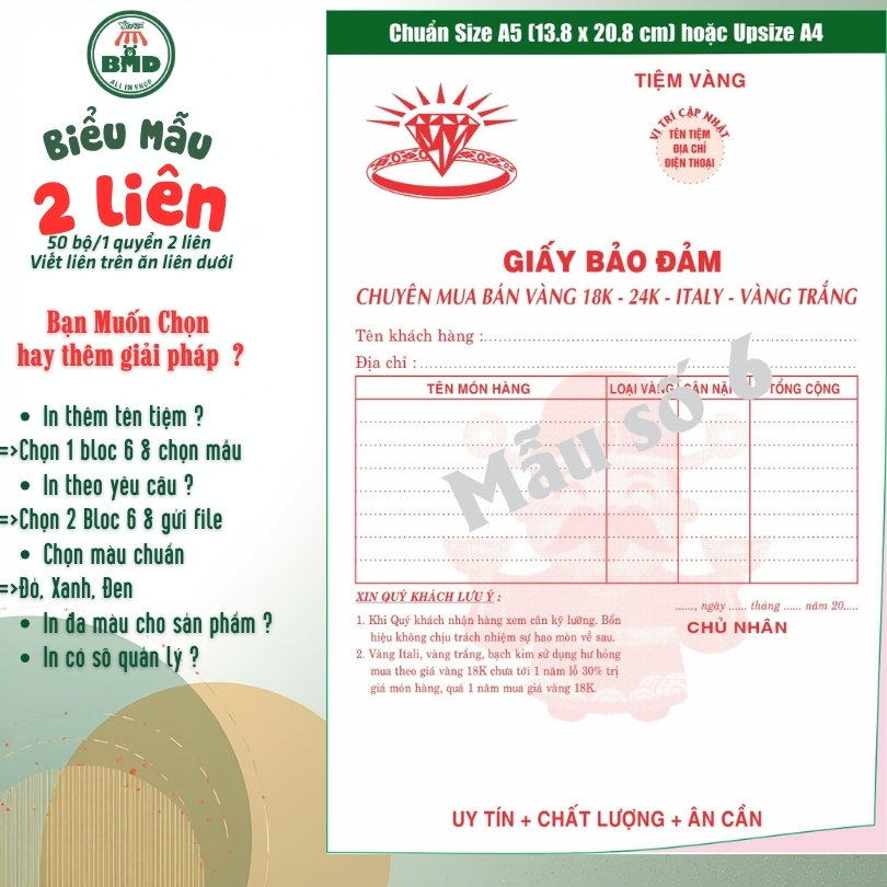 Giấy Bảo Đảm tiệm vàng 2 liên-Bloc 2 (in sẵn) & Bloc 6 (chọn mẫu in tên) hoặc theo thiết kế