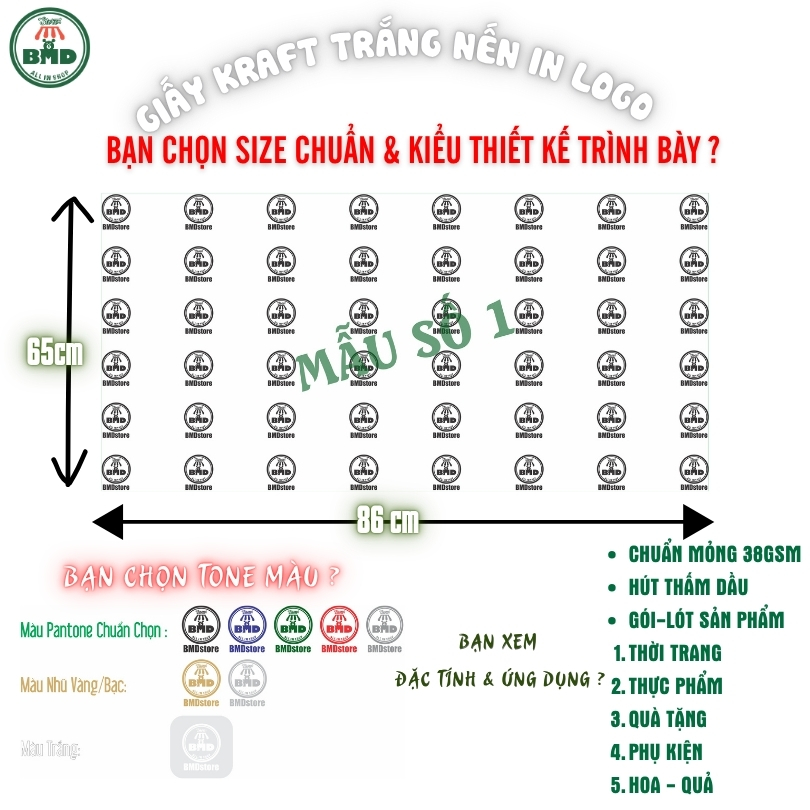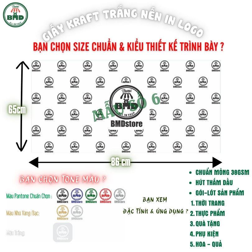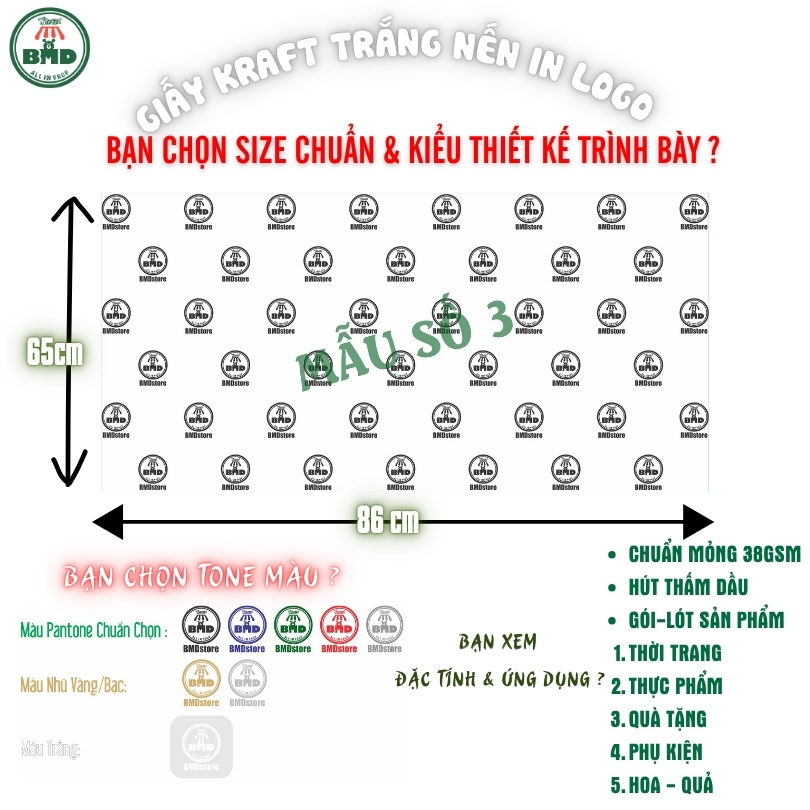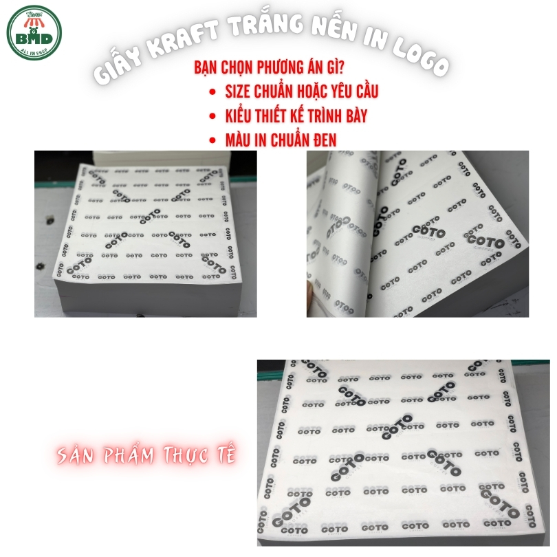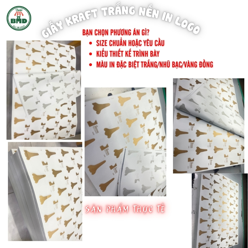 Giấy Kraft trắng nến (hút thấm dầu) mỏng 38gsm in logo với 3 size chuẩn 65x32/65x48/65x86 gói-lót sản phẩm Thời Trang-Thực Phẩm - Quà Tặng - Phụ Kiện Trang sức - Hoa