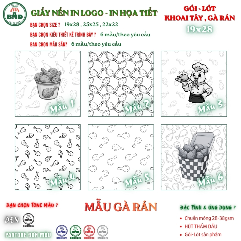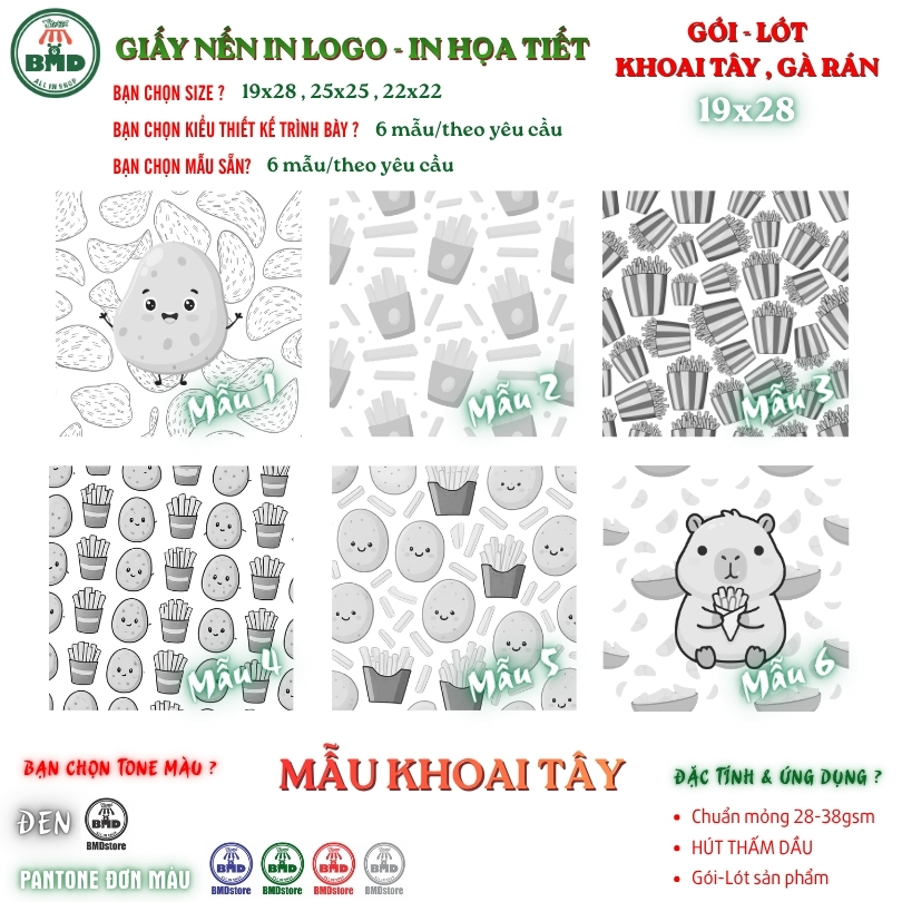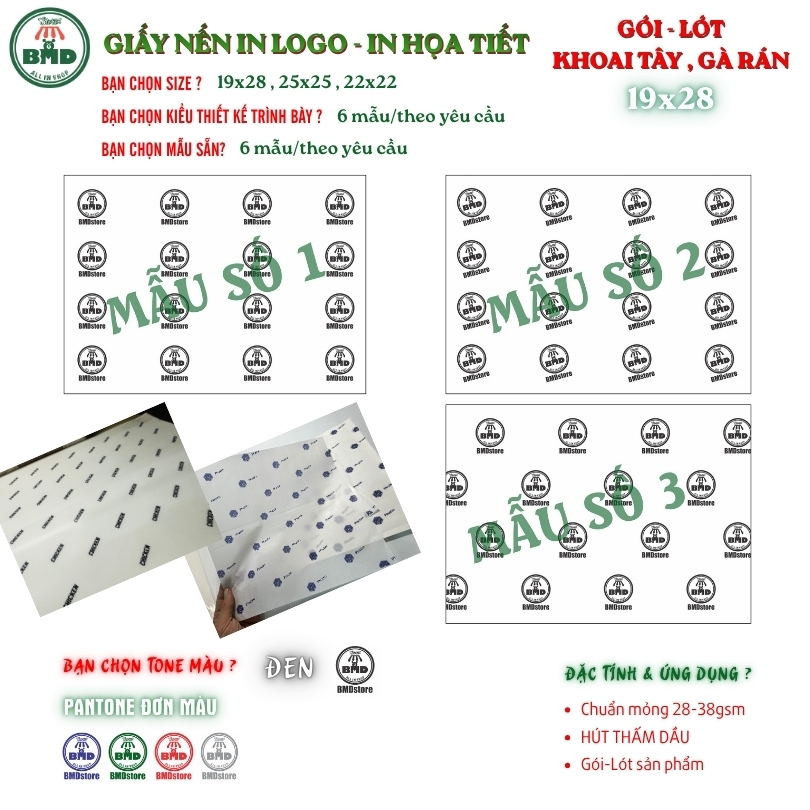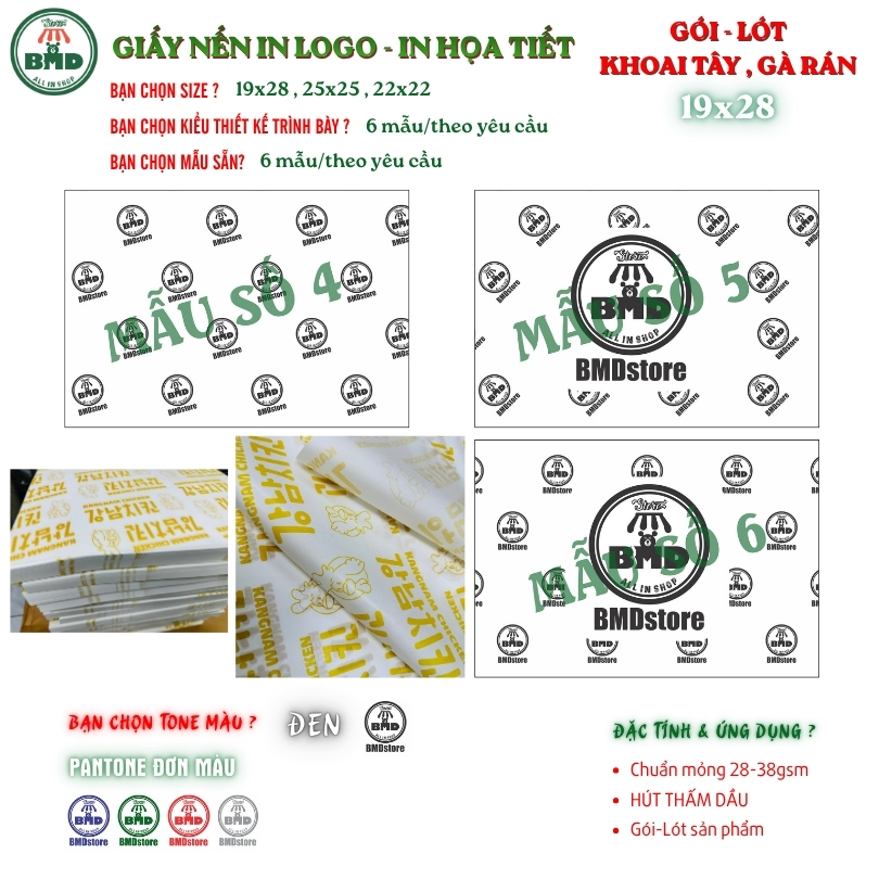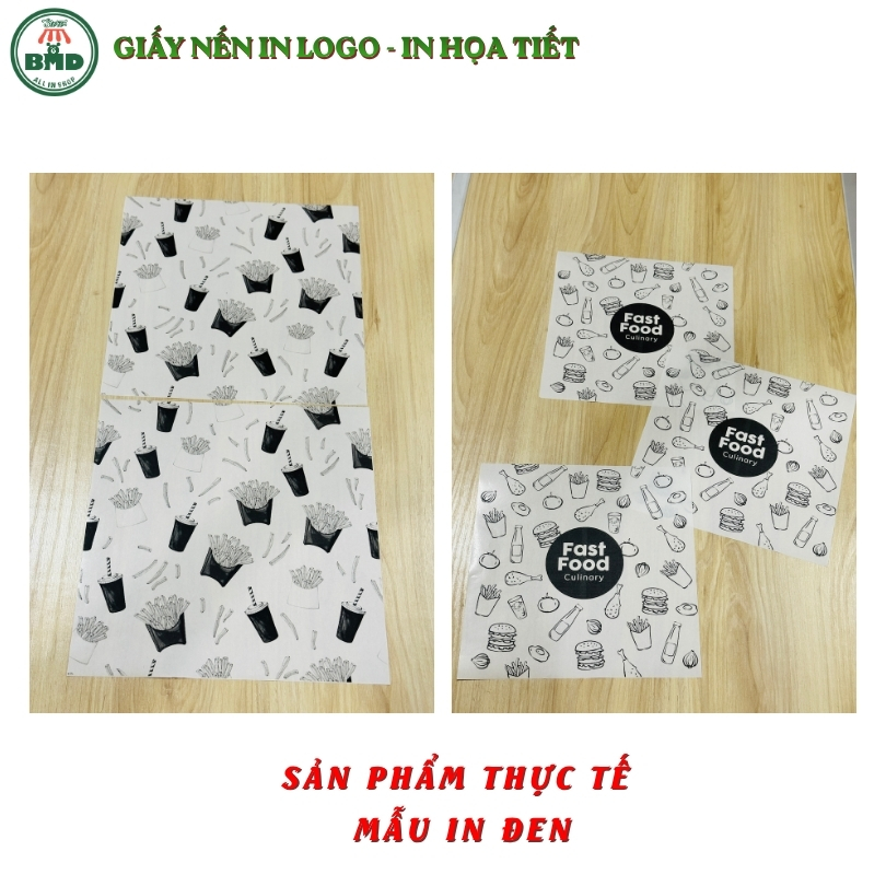 Giấy nến in logo hút thấm dầu chuẩn >28gsm | Giấy gói khoai tây, gà rán | Size 19x28cm | In thương hiệu – lấy nhanh