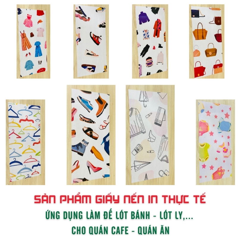 Giấy được cắt theo nhiều kích thước tùy nhu cầu (10x10 / 20x20 / 20x30 / 30x30 cm…), đáp ứng linh hoạt cho quán café, nhà hàng, tiệm bánh và các thương hiệu quà tặng.