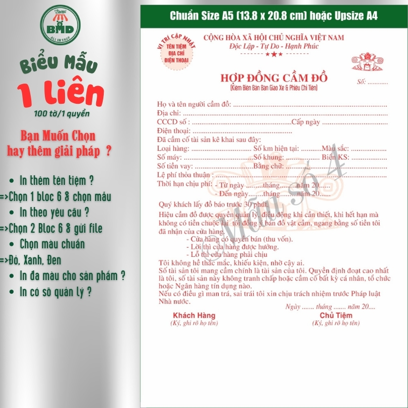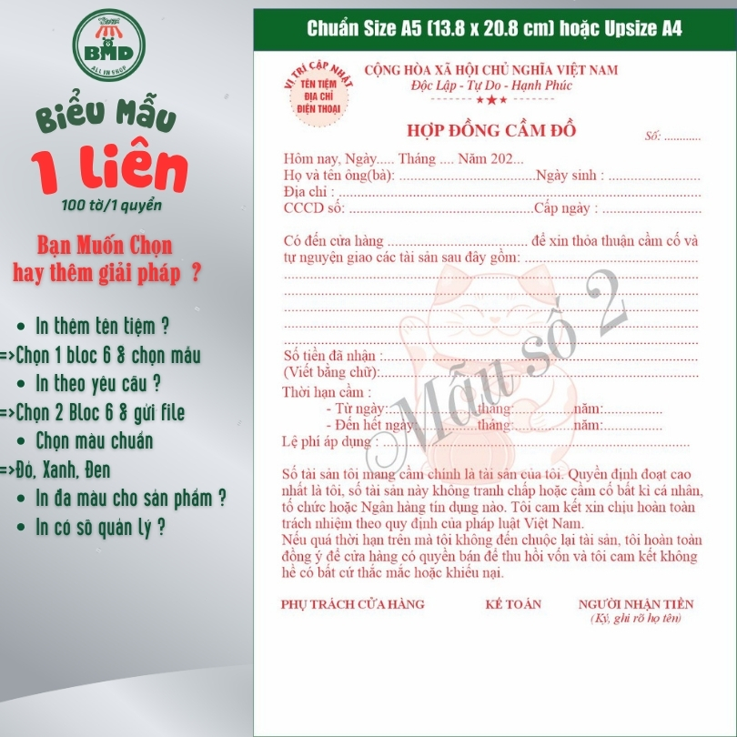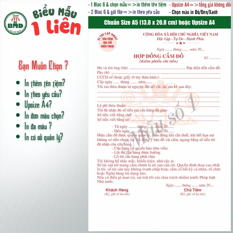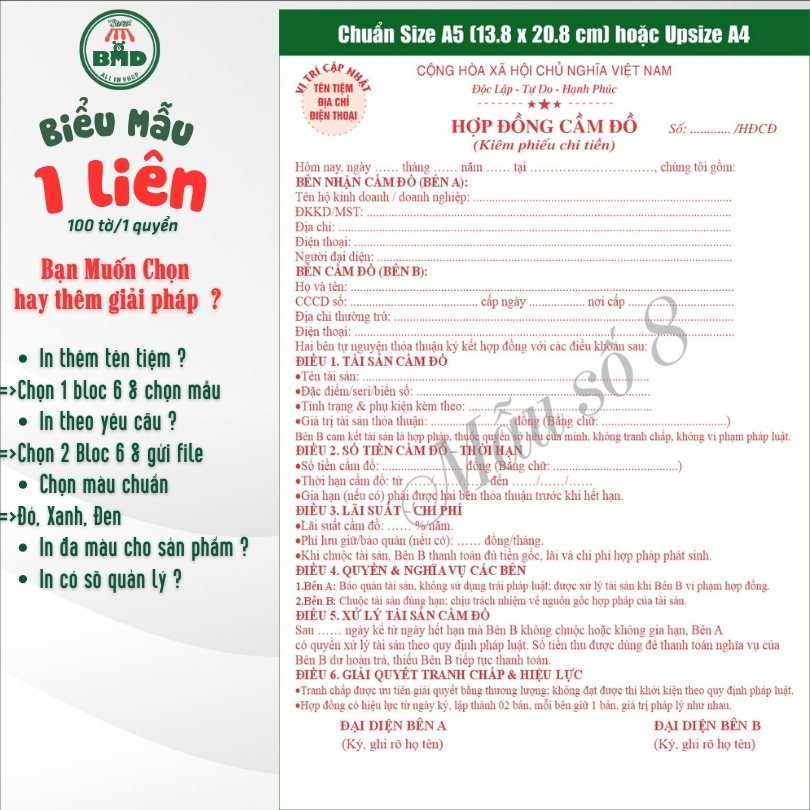Hợp đồng cầm đồ 1 liên-Bloc 2 (in sẵn) & Bloc 6 (chọn mẫu in tên) hoặc theo thiết kế