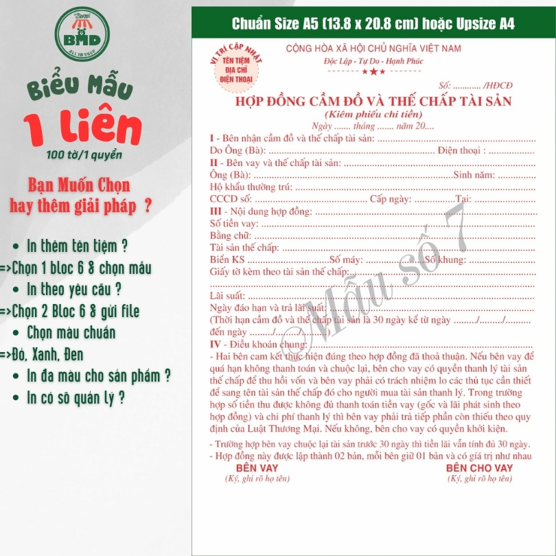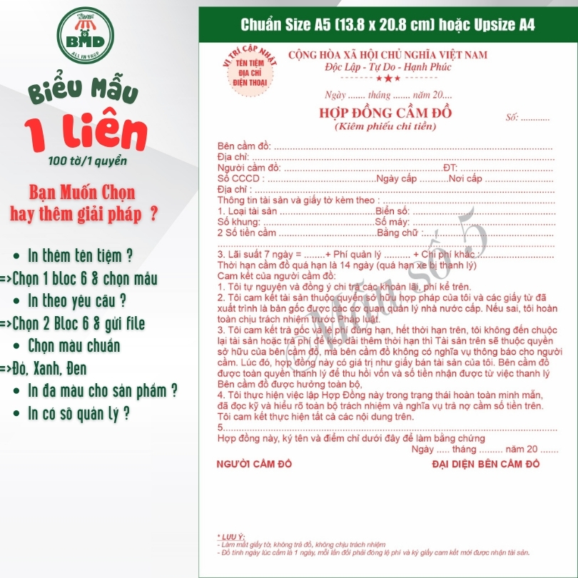 📝 HỢP ĐỒNG CẦM ĐỒ 1 LIÊN – BLOC 2 & BLOC 6 (In theo mẫu có sẵn hoặc thiết kế theo yêu cầu) 📦 SẢN PHẨM DẠNG BLOC 🔹 BLOC 2 QUYỂN (IN SẴN) Chọn mẫu có sẵn Phù hợp cần in nhanh –...